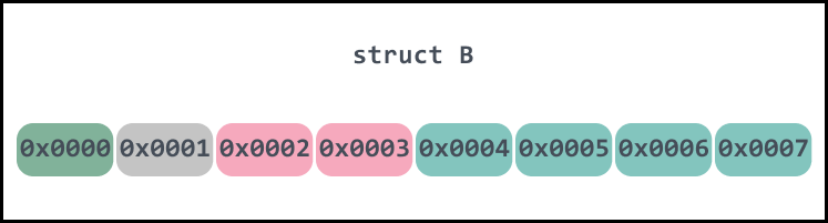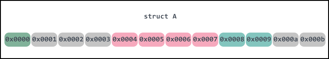假设结构体A中a的起始地址为0x0000,能够被最宽的数据成员大小4bytes(int32)整除,所以从0x0000开始存放占用一个字节即0x00000x0001;b是int32,占4bytes,所以要满足条件2,需要在a后面padding3个byte,从0x0004开始;c是int16,占2bytes故从0x0008开始占用两个字节,即0x00080x0009;此时整个结构体占用的空间是0x0000~0x0009占用10个字节,10%4 != 0, 不满足第三个原则,所以需要在后面补充两个字节,即最后内存对齐后占用的空间是0x0000~0x000B,一共12个字节。