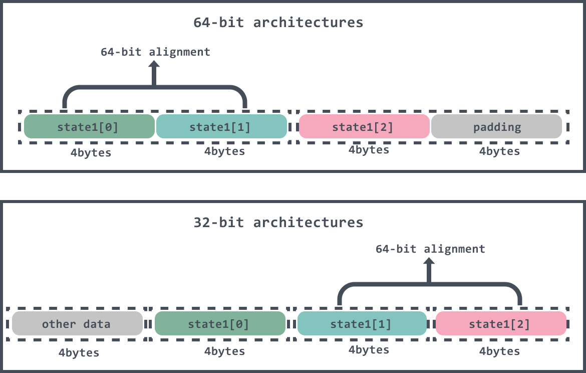 答案自然是不可以,因为uint32的对齐保证是4bytes,64位架构中一次性处理事务的一个固定长度是8bytes,如果用state1的后两个元素表示一个64位字的字段的话CPU需要读取内存两次,不能保证原子性。