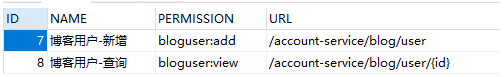 然后我们在 sys_permission表中添加2个用户权限,再将其授予给用户角色
