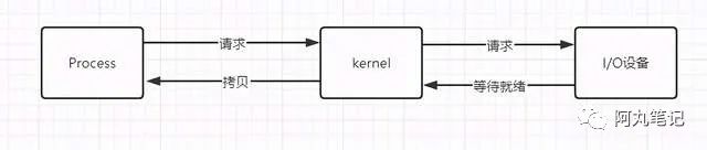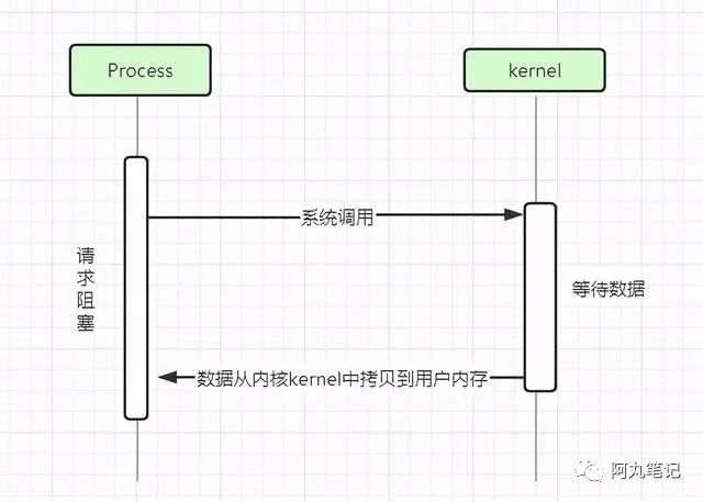 数据准备完毕,从内核kernel拷贝到用户态内存(仍旧阻塞),然后kernel返回结果,用户进程process结束阻塞,重新运行。