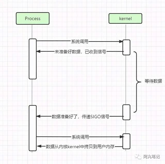 用户进程发起I/O请求后,立刻就可以开始去做其它的事。而另一方面,从kernel的角度,当它收到一个请求之后,首先它会立刻返回,所以不会对用户进程产生任何block。然后,kernel会等待数据准备完成,然后将数据拷贝到用户内存,当这一切都完成之后,kernel会给用户进程发送一个signal,告诉它I/O操作完成了。