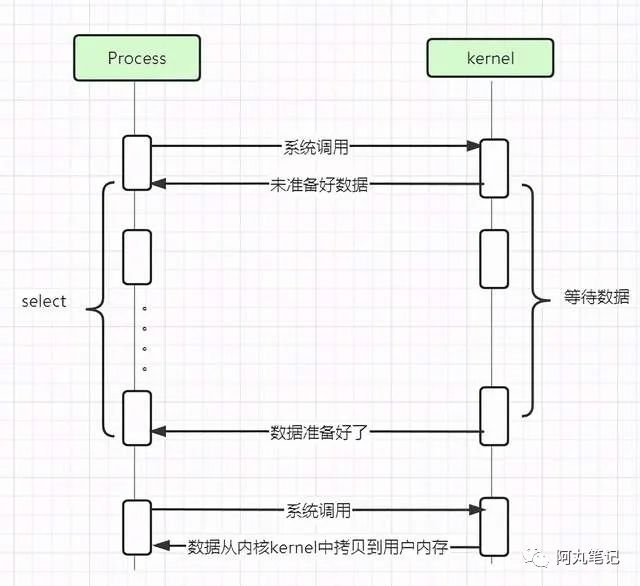 然后select调用进程可以自己或通知另外的进程(注册进程)来再次发起读取IO,然后process将数据从kernel拷贝到用户进程,读取内核中准备好的数据。