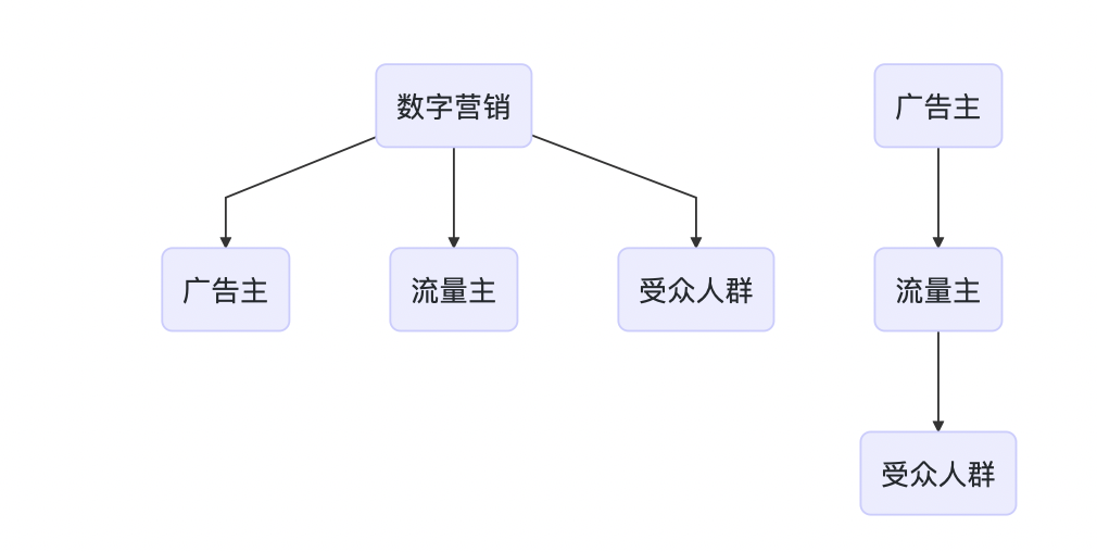 数字营销模式中三个基本角色和模式:广告主通过流量主把广告内容传递到受众人群。