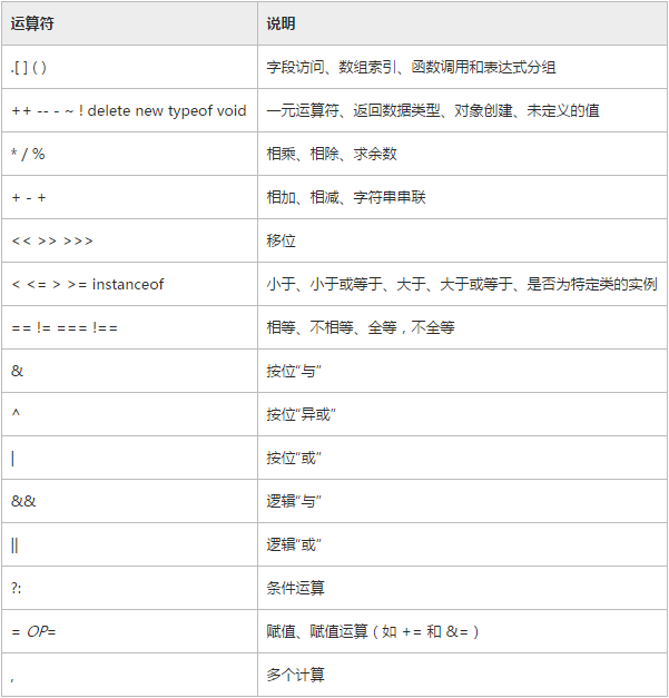 下面的表将运算符按照优先级的不同从高(20)到低(1)排列,但这个不是最新的,至少没包括可选链,建议参考这个表[1]或者 MDN[2]。