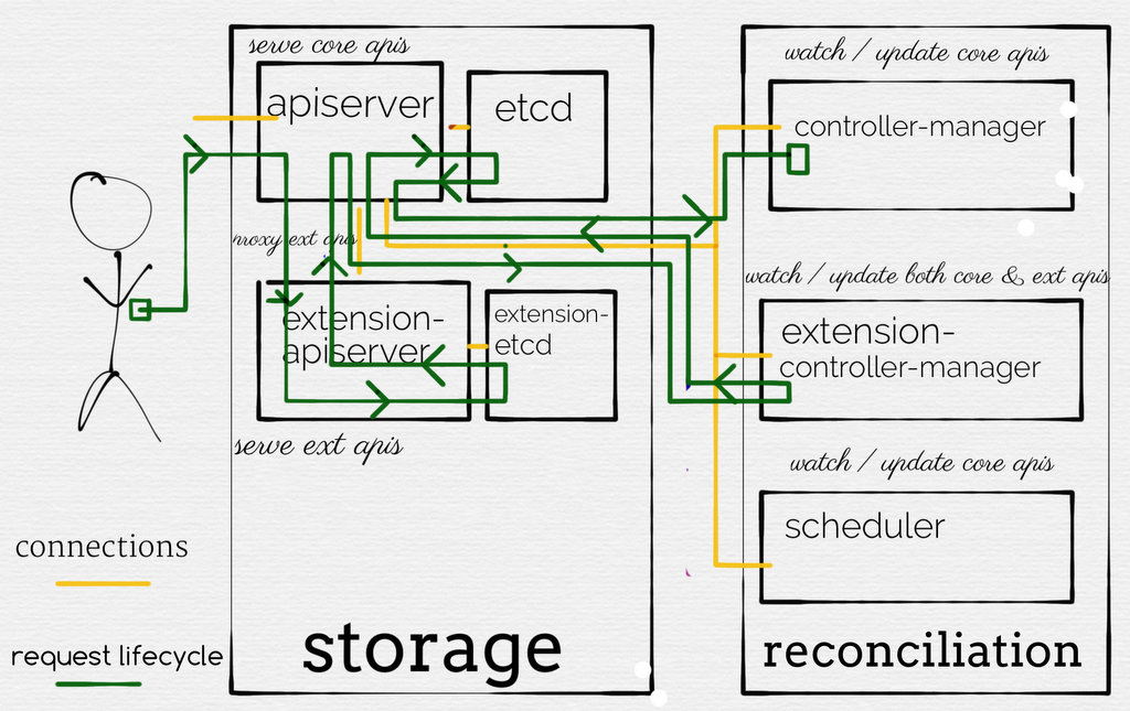 aggregated server实现CR(自定义API资源) 的CRUD API接口,并可以灵活选择后端存储,可以与core kube-apiserver一起公用etcd,也可自己独立部署etcd数据库或者其它数据库。aggregated server实现的CR API路径为:/apis/$GROUP/$VERSION,具体到sample apiserver为:/apis/wardle.example.com/v1alpha1,下面的资源类型有:flunders以及fischers