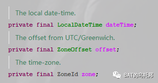 ZonedDateTime可简单认为是LocalDateTime和ZoneId的组合。而ZoneOffset是其内置的动态计算出来的一个次要信息,以确保输出一个瞬时值而存在,毕竟在某个瞬间偏移量ZoneOffset肯定是确定的。ZonedDateTime也可以理解为保存的状态相当于三个独立的对象:LocalDateTime、ZoneId和ZoneOffset。某个瞬间 = LocalDateTime + ZoneOffset。ZoneId确定了偏移量如何改变的规则。所以偏移量我们并不能自由设置(不提供set方法,构造时也不行),因为它由ZoneId来控制的。
