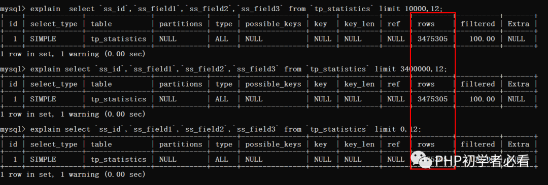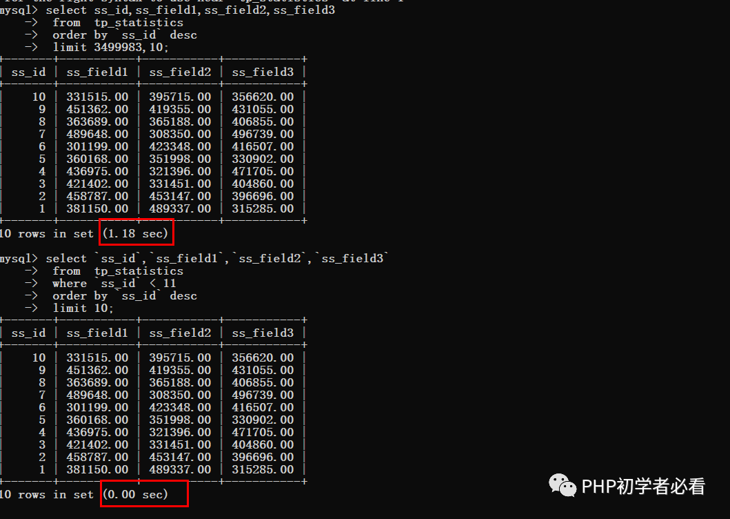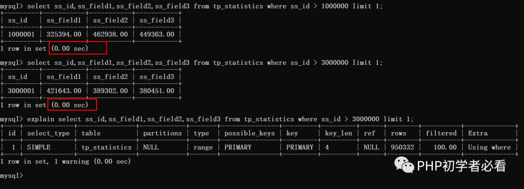 select ss_id,ss_field1,ss_field2,ss_field3 from tp_statistics inner join ( select ss_id from tp_statistics order by ss_id limit 3000000,10) b using (ss_id);