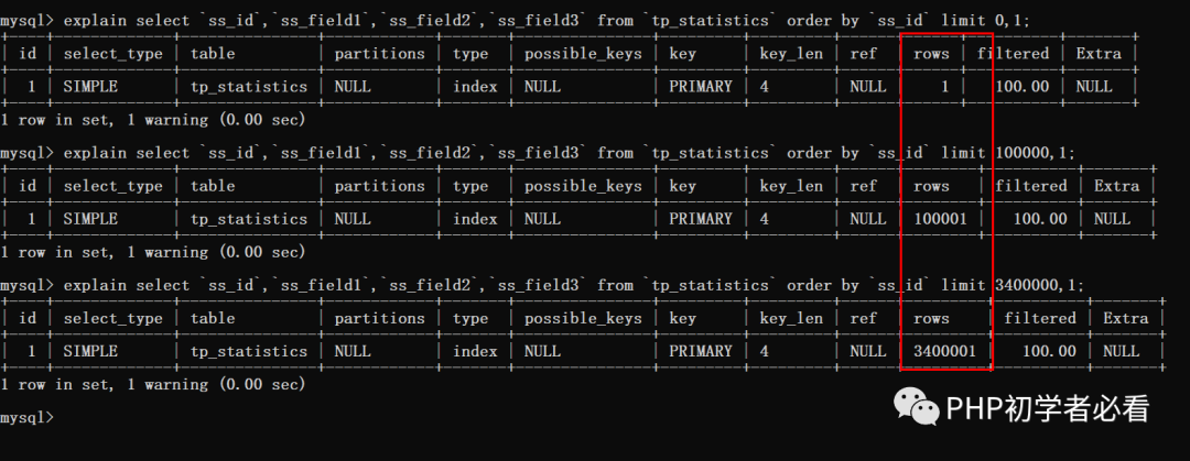 通过这里看到当使用了排序时数据库扫描的行数就是偏移量加上需要查询的数量。