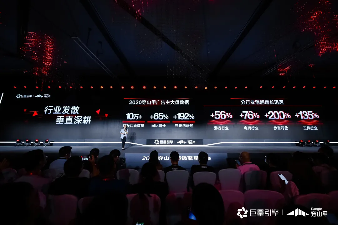 在广告主层面,穿山甲运营负责人郑文雅介绍到,穿山甲活跃广告主数量已超过了10万,同比增长超过65%,在游戏,电商,教育,工具等重点行业成长速度迅猛。从预算分布来看,穿山甲全年预算的大部分是头部广告主和平台内部优质App创造的。随着穿山甲品牌GD的上线,引入了更多高品质的品牌广告主。