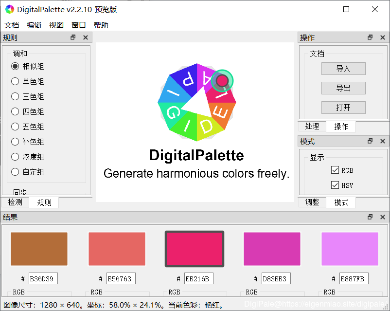 DigitalPalette 是一款免费开源软件,它可以帮助您从色彩转轮或者已有图像中生成一组符合一定调和规则的色彩,并应用到您的创作中。