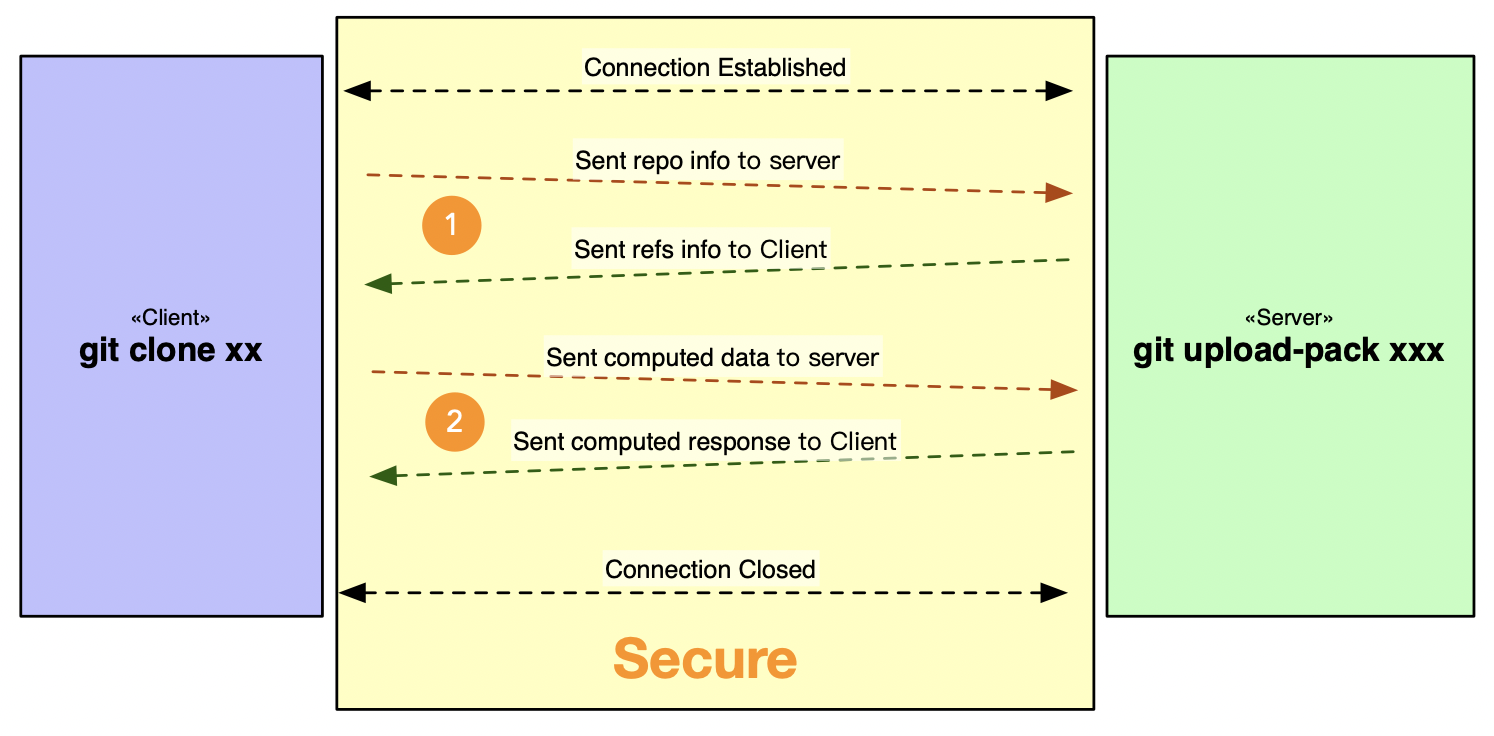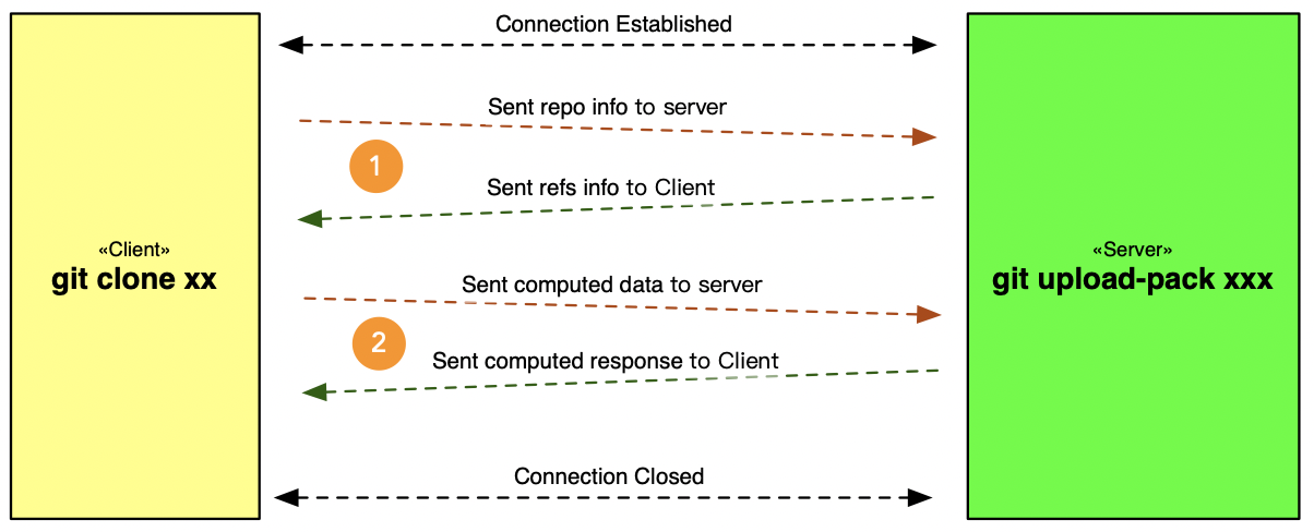 Git 协议也是如此,只不过相比于 HTTP 协议,Git 协议直接在四层与服务端建立连接,通过这个长链接直接完成两个步骤: