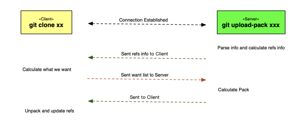 在上面我们研究 HTTP 智能协议的实现的时候,我们知道 Git 客户端跟服务端的交互主要包含两个步骤:
