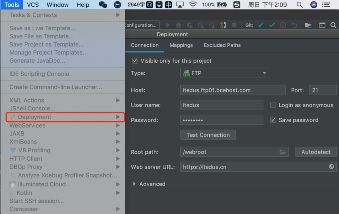 在IDEA的菜单栏上,Tools 中有一个 Deployment 的选项,可以配置FTP以及其他SFTP。