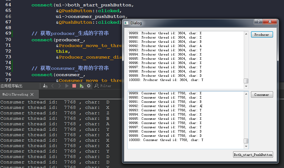 Producer按钮生成资源,保存到数组中,在左侧文本框中显示Producer所在的线程及生成的资源。Consumer按钮消耗数组中的资源,在左侧文本框中显示Consumer所在的线程及消耗的资源。这两个按钮是单独运行。Both_start_PushButton按钮同时启动两个子线程,一个生产资源,一个消耗资源,生产和消耗的都在左边的文本框中显示。