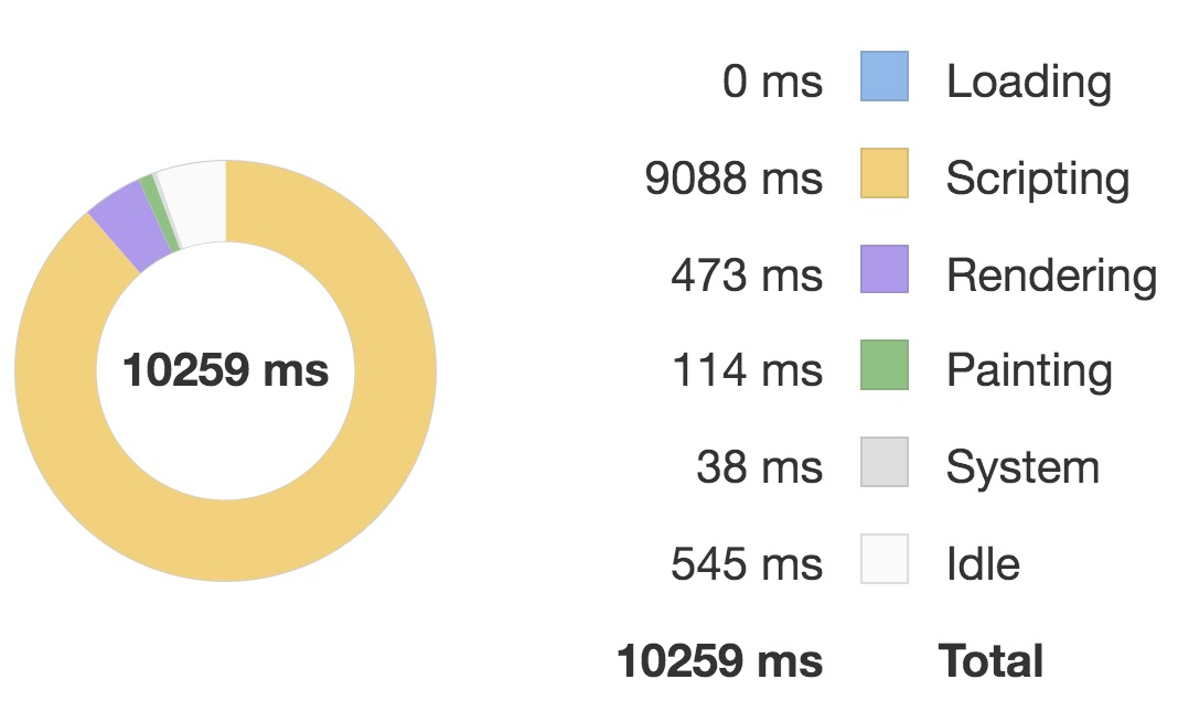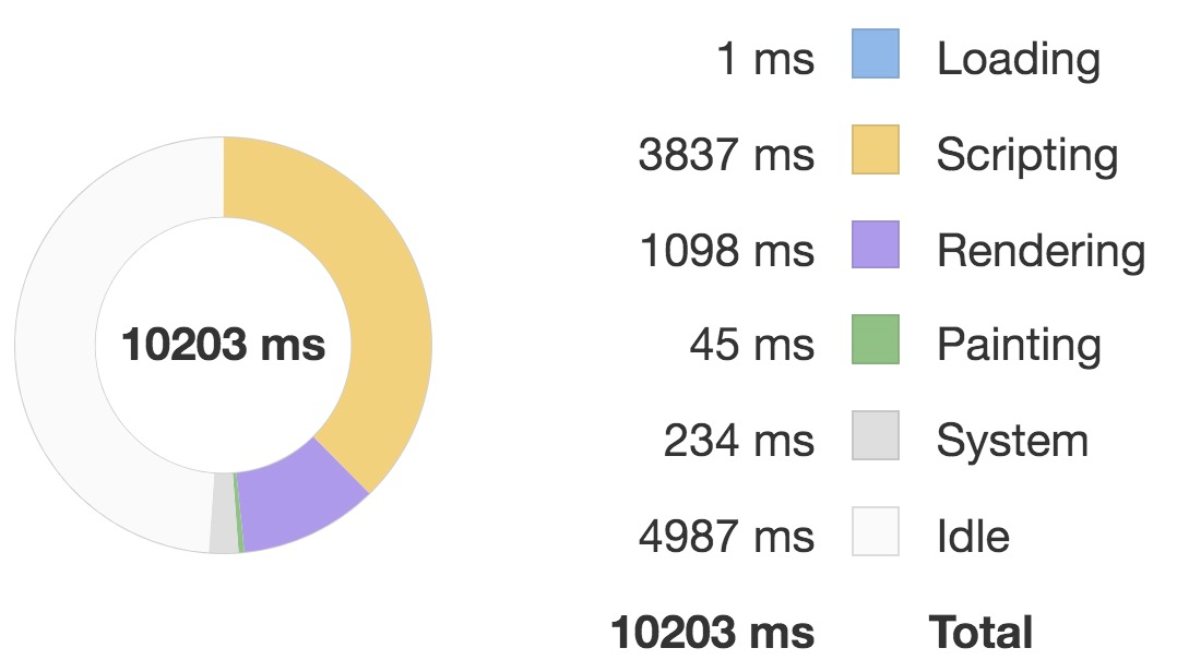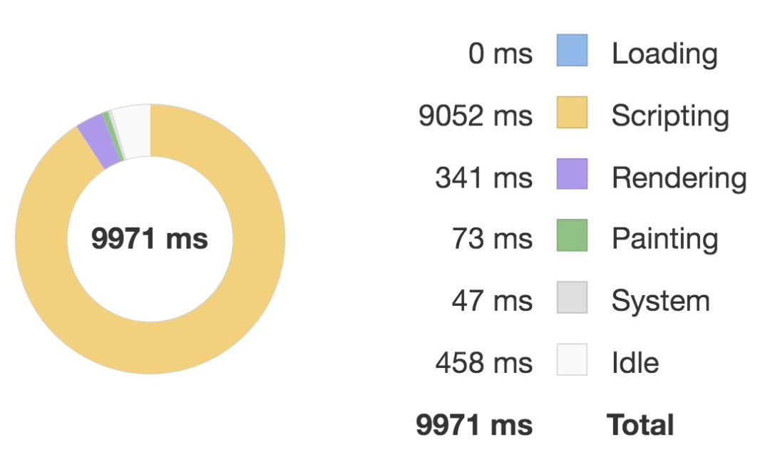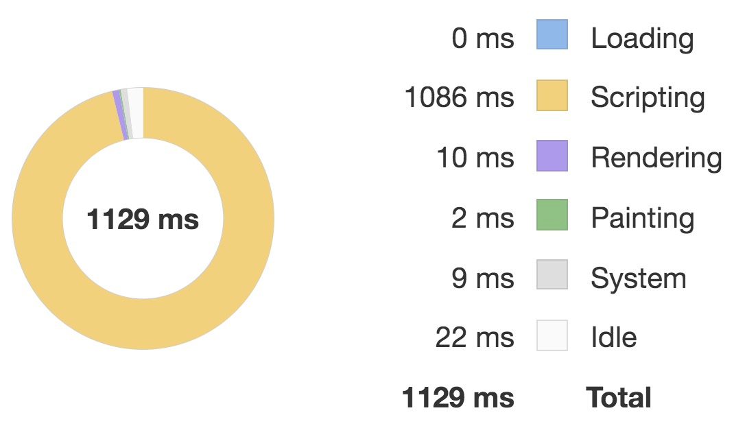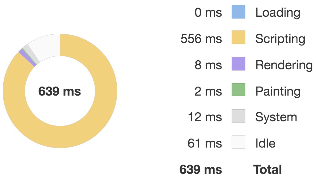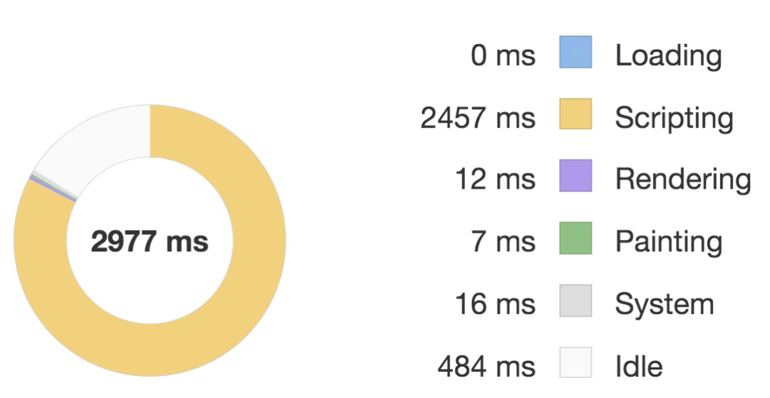 对比这两张图我们可以发现,优化前总的 script 执行时间要比优化后的还要少一些,但是从实际的观感上看,优化前点击提交按钮,页面会卡死 1.2 秒左右,在优化后,页面不会完全卡死,但仍然会有渲染卡顿的感觉。