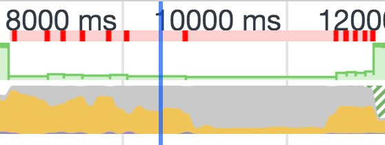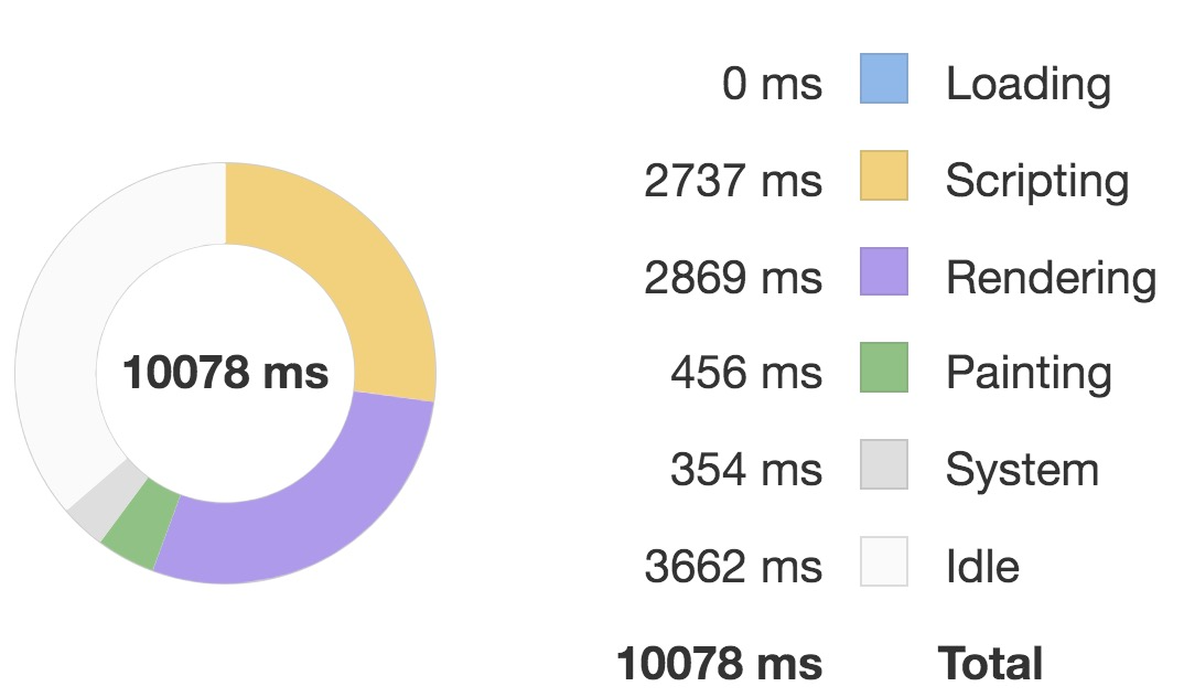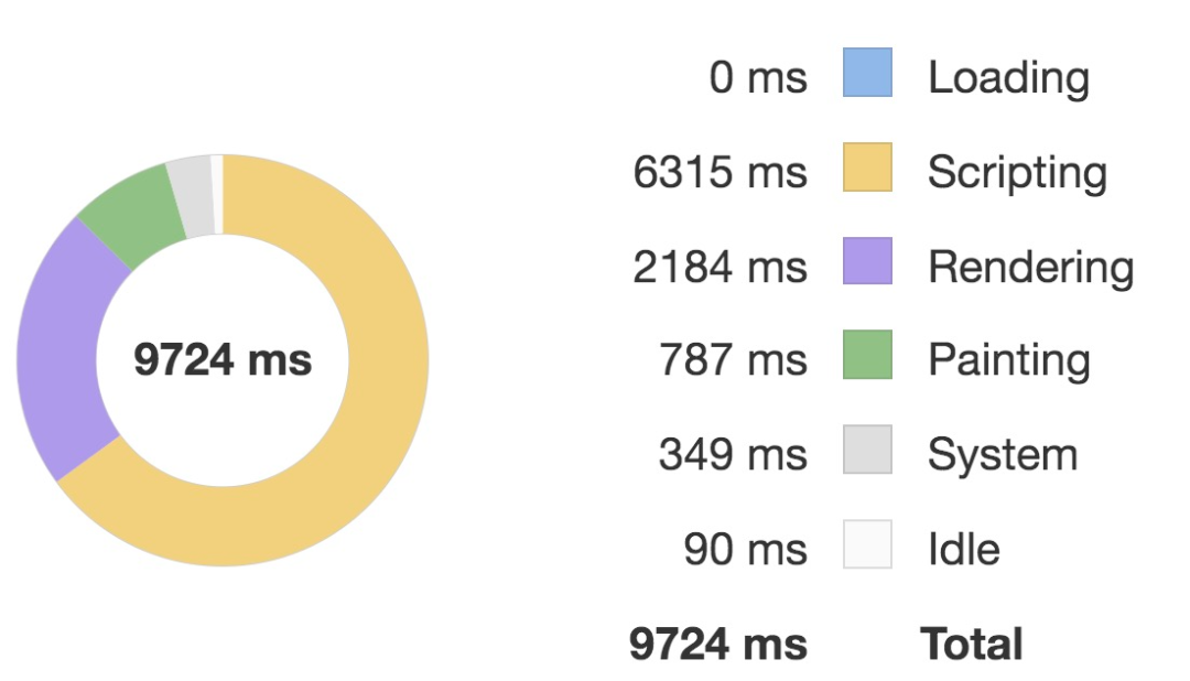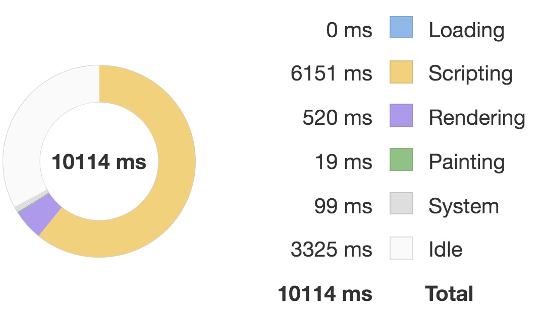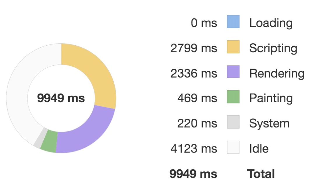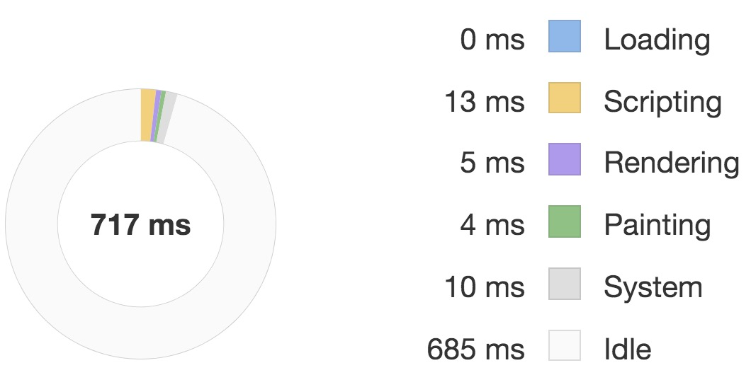 对比这两张图我们可以发现,优化前总的 script 执行时间要比优化后的还要少一些,但是从实际的观感上看,优化前点击提交按钮,页面会卡死 1.2 秒左右,在优化后,页面不会完全卡死,但仍然会有渲染卡顿的感觉。