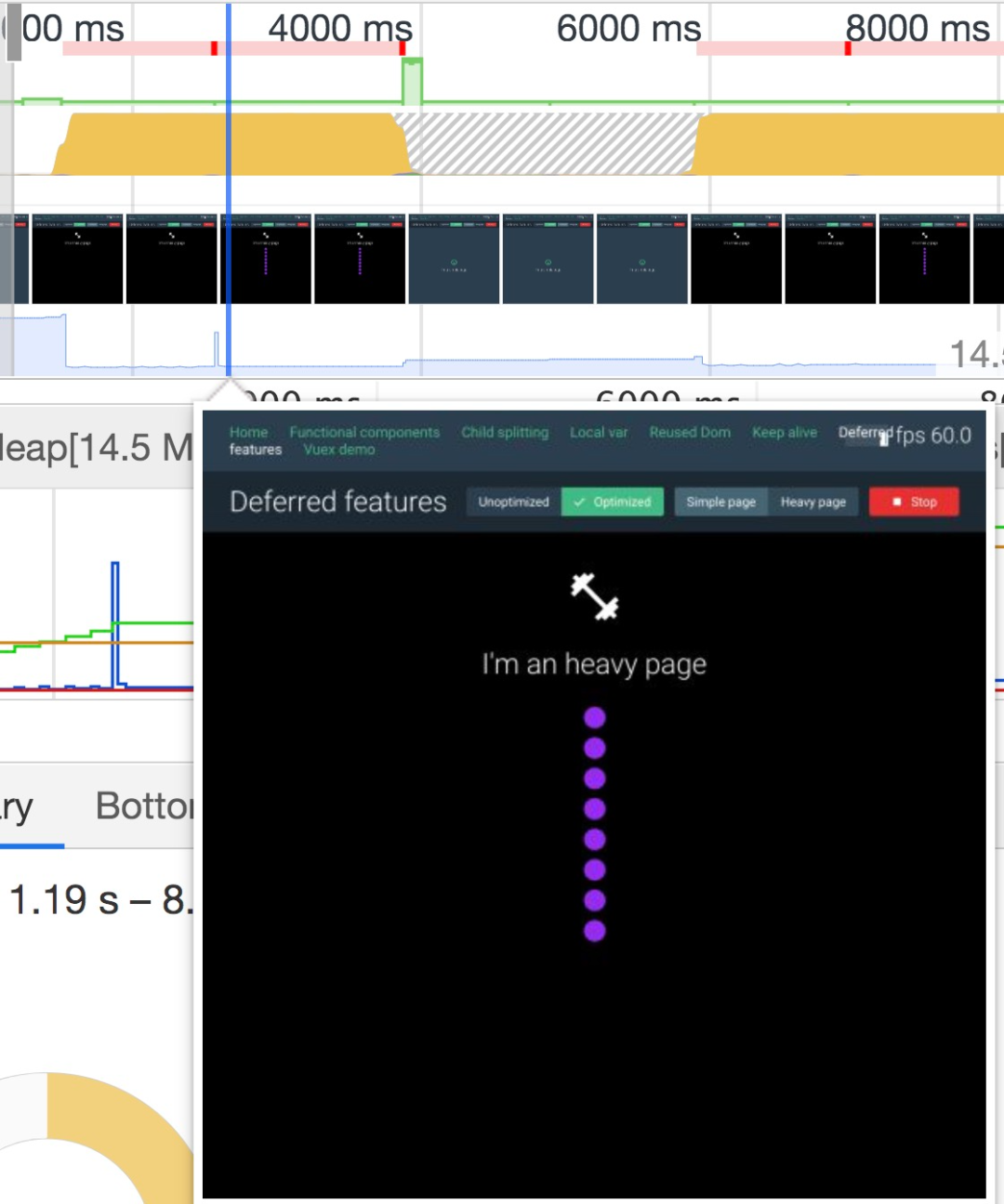 Defer 的主要思想就是把一个组件的一次渲染拆成多次,它内部维护了 displayPriority 变量,然后在通过 requestAnimationFrame 在每一帧渲染的时候自增,最多加到 count。然后使用 Defer mixin 的组件内部就可以通过 v-if="defer(xxx)" 的方式来控制在 displayPriority 增加到 xxx 的时候渲染某些区块了。