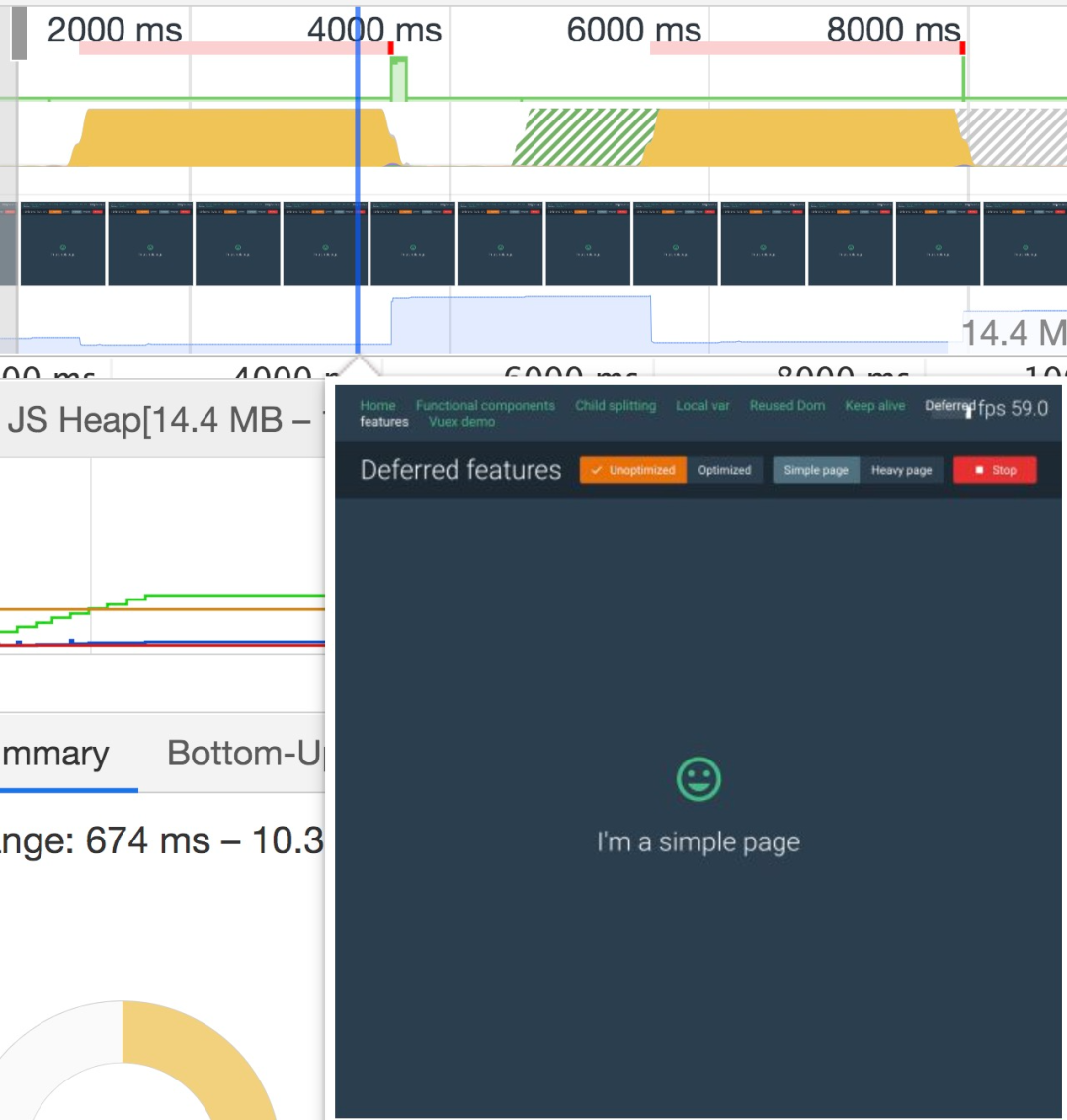 还是前面的示例,我们需要开启 View list,然后点击 Genterate items 按钮创建 10000 条假数据(注意,线上示例最多只能创建 1000 条数据,实际上 1000 条数据并不能很好地体现优化的效果,所以我修改了源码的限制,本地运行,创建了 10000 条数据),然后分别在 Unoptimized 和 RecycleScroller 的情况下点击 Commit items 按钮提交数据,滚动页面,开启 Chrome 的 Performance 面板记录它们的性能,会得到如下结果。