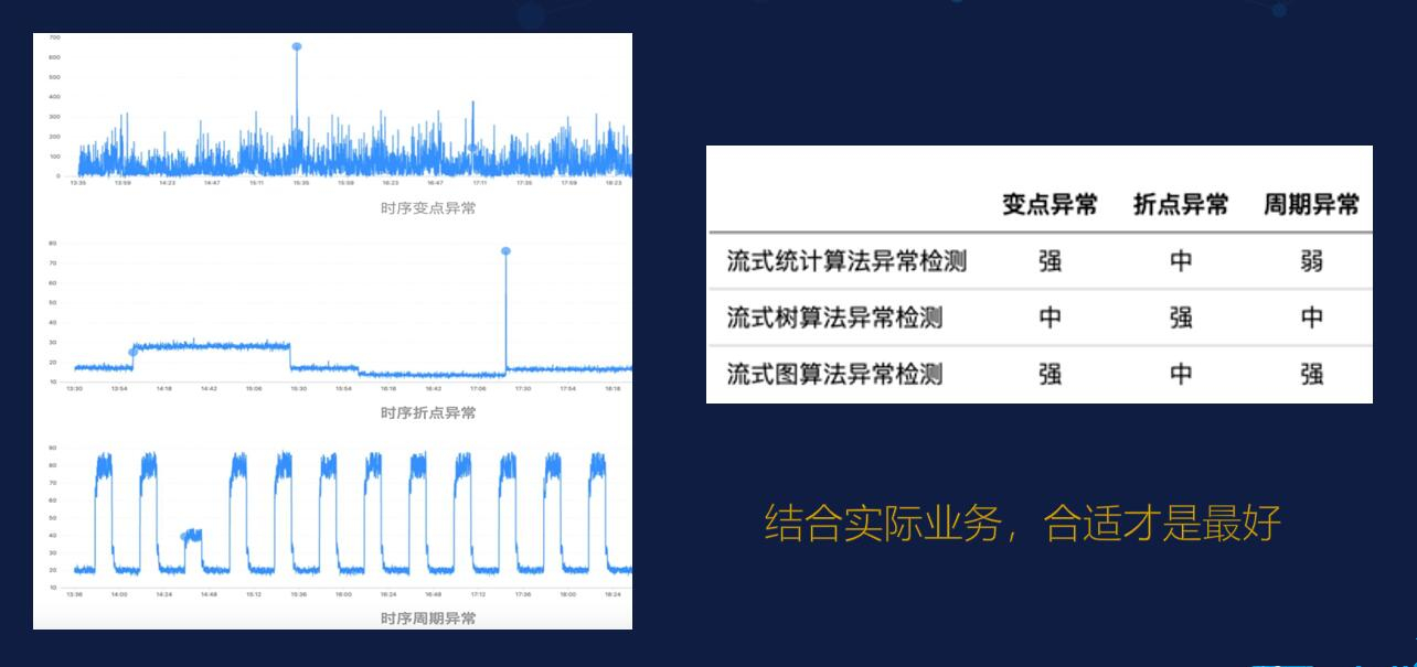 时序周期异常:对于这种周期异常的检测,推荐的检测方法是流式图算法。这里说的图算法其实是指图神经网络。这点我之前并没有提到,是因为目前图算法还处于一个初步阶段,它的研究并不成熟,把图神经网络和异常值检测结合起来的运用还特别的少。但是因为图神经网络现在的发展很快,所以在未来它一定会在异常值检测方面有很好的效果。