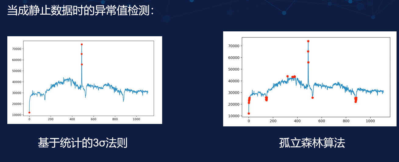 上图是将之前的日活统计当成整体数据后检测的结果,这是一个静止的数据。我们可以看到左图 3σ 法则的检测效果并不好,只检测出了少数的几个点;而右图使用孤立森林算法则的优势则可以很明显的看到,它基本能够将人眼看到的异常全部检测出来,而且还有一些人眼没看到需要局部放大才能发现的数据,它也能够检测出来。