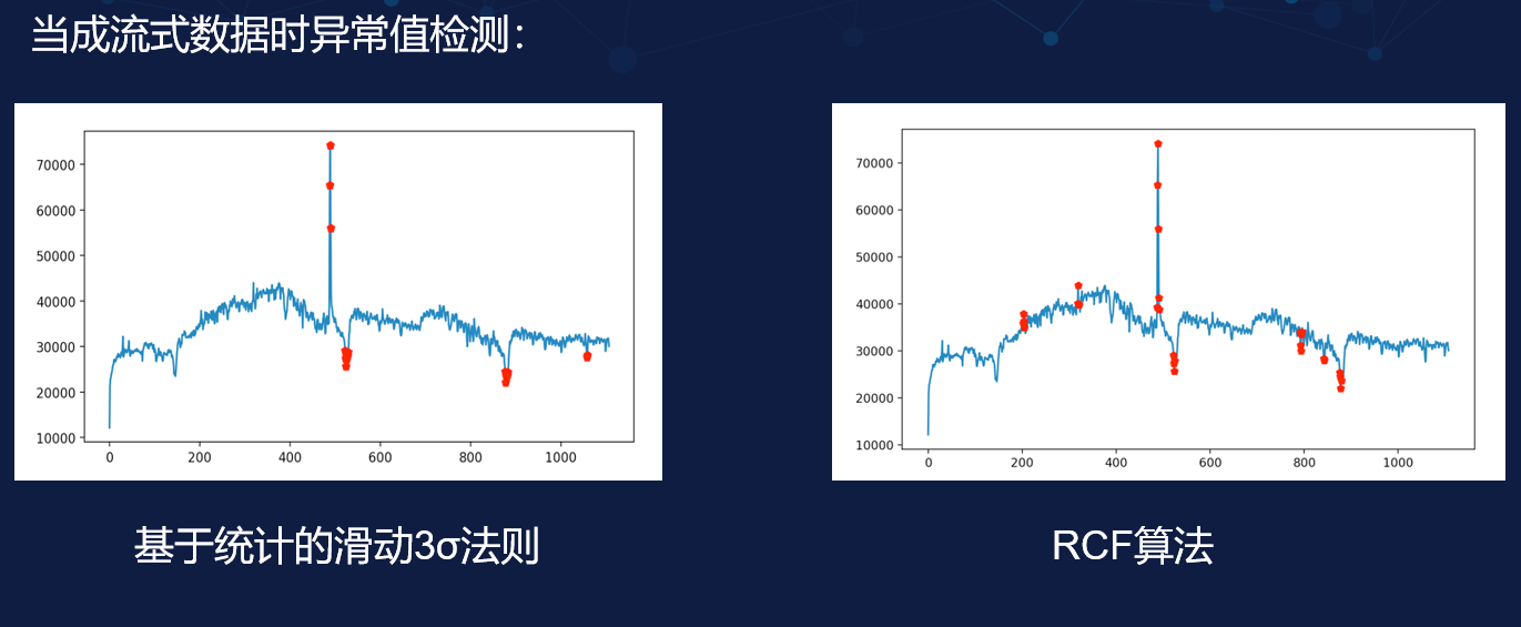 **无论是静止数据还是流式数据,我们都可以明显看到基于 RCF 的方法检测的更准确一些,但是这并不代表我们可以完全放弃基于统计的方法。**当我们在检测那些数据量很大而且异常点的损失较少的数据时,我们仍然可以使用基于统计的方法。虽然它的精准度不如 RCF,但是它操作简单。目前大多数没有接触异常值检测的公司使用的都是基于统计的方法,通过设置一个 3σ 阈值或使用箱体图来进行异常值判断。而在对异常值检测有较深接触后,RCF 就成为了异常检测的主流。