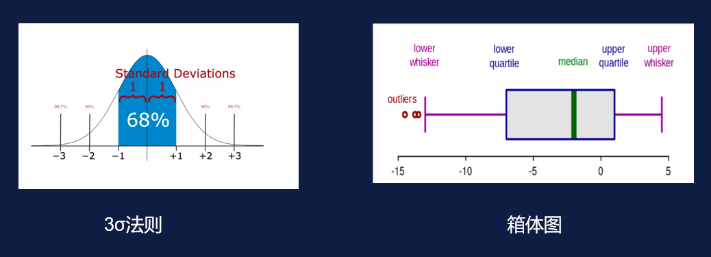 如上图所示,左图是我们经常听到的 3σ 法则,3σ 法则比较简单但很实用,它是一个经验法则,具体是什么意思呢?其实 σ 是标准差,当我们检测数据服从正常的统计分布时,我们可以将超过 3σ 的数据认为是异常数据。它的标准均值为 0,从标准分布图来看,大约有 0.3% 的数据为异常值。当然如果你的均值是非 0 分布,你可以把均值加上去。不过由于 3σ 法则是一个经验法则,还是比较粗糙的,因此在实际工作中,建议大家只在某些特定的场景下使用它。