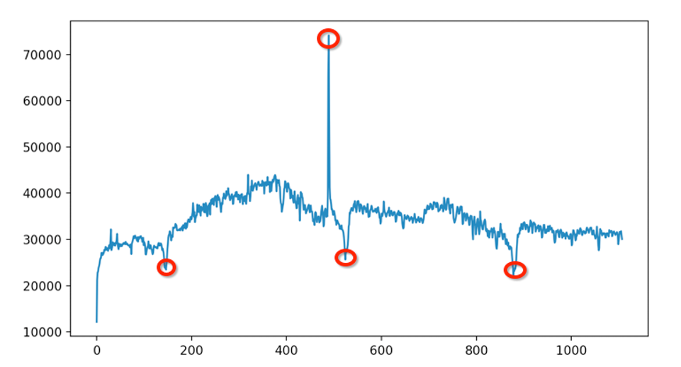 上图是某应用 2016 年 8 月到 2019 年 9 月的日活统计。这么直接一看就可以看到它有很多的突变点,这些点可能就是它的异常行为。而异常值检测要做的就是使用统计或者机器学习的方法将这些异常点找出来。