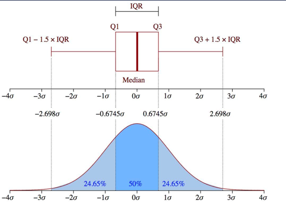 上图是两种统计方式的对应关系。假设数据分布是一个纯粹的正态分布,我们可以看到箱体图对应的 σ 值只有 2.7σ 左右,不到 3σ 。当然很多时候我们并不知道它的具体分布是什么,需要根据样本的方差、标准差来求 σ,如果你实在不知道是什么分布,可以将它假设为是一个正态分布。因为正态分布是自然界一个比较“和谐“的分布,一般场景中就算有偏差也不会过于离谱。