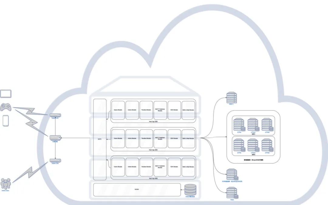 该项目核心战斗类似韩国手游《魔灵召唤》,且部分玩法要求支持跨服对抗。来自国内著名互联网公司的高级架构师带领服务器端团队,使用了如下图的架构: