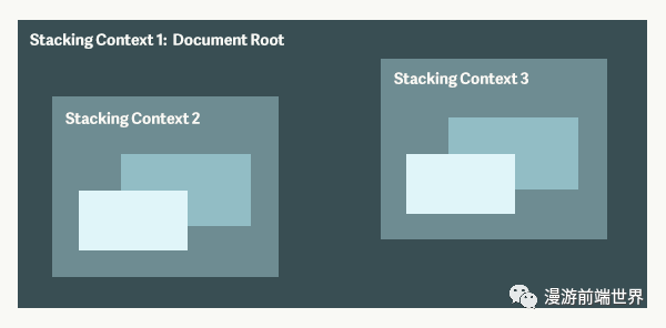 如图所示,层叠上下文 1 指的就是文档根部,而层叠上下文 2 和 3 位于 1 的某个层叠等级中。此外,这两个层叠上下文各自会包含新的层叠等级。