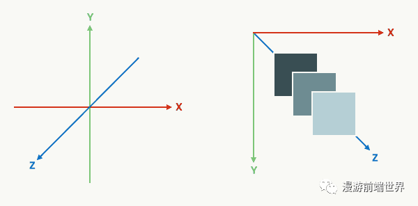 由于屏幕是一块二维平面,我们实际上并没有真的看到 z 轴,更多的是通过透视的形式。具体地说,多个元素共享同一块二维平面时,有的元素在顶部,有的元素在底部,我们由此感受到了 z 轴的存在。