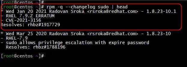 3、使用如下命令可以看到sudo的rpm包的更新记录说明 可以看到已经修复了该CVE-2021-3156漏洞