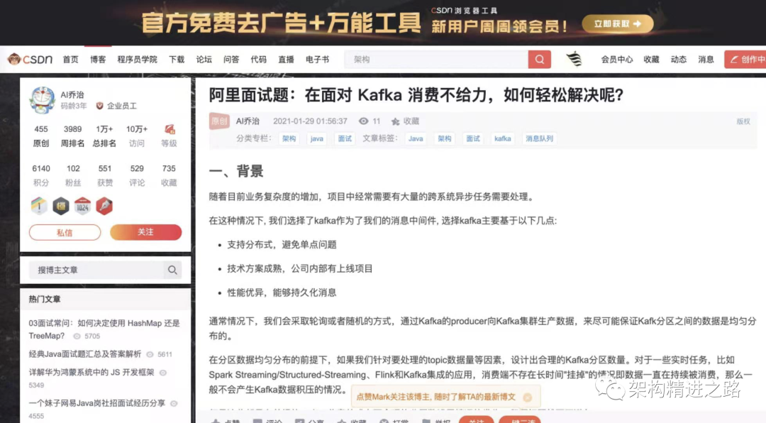 我的原创文章:面对Kafka消费不给力,如何轻松解决呢?,发布时间:2021-1-24