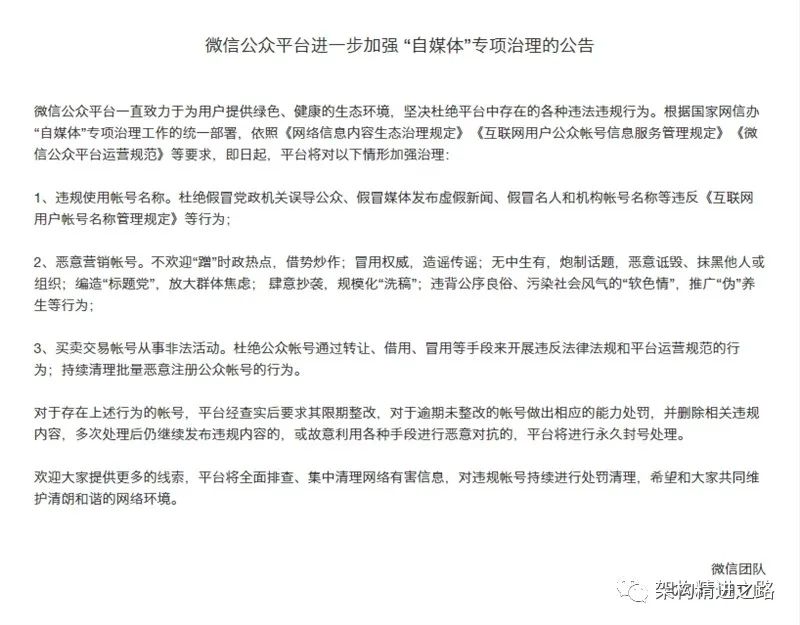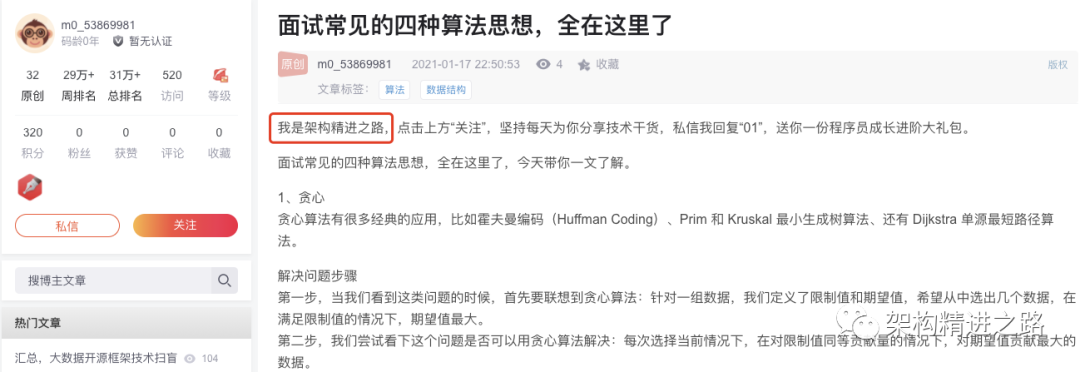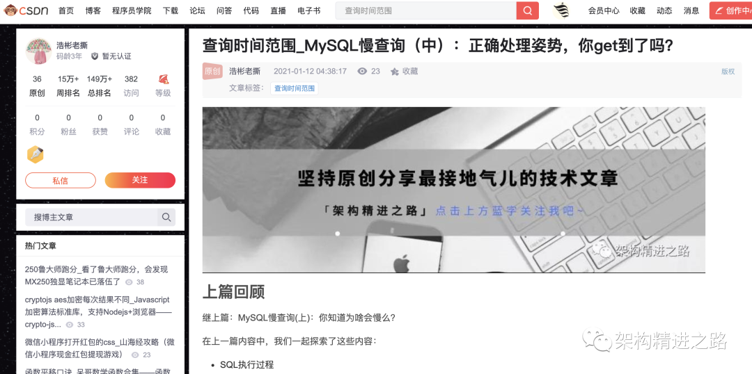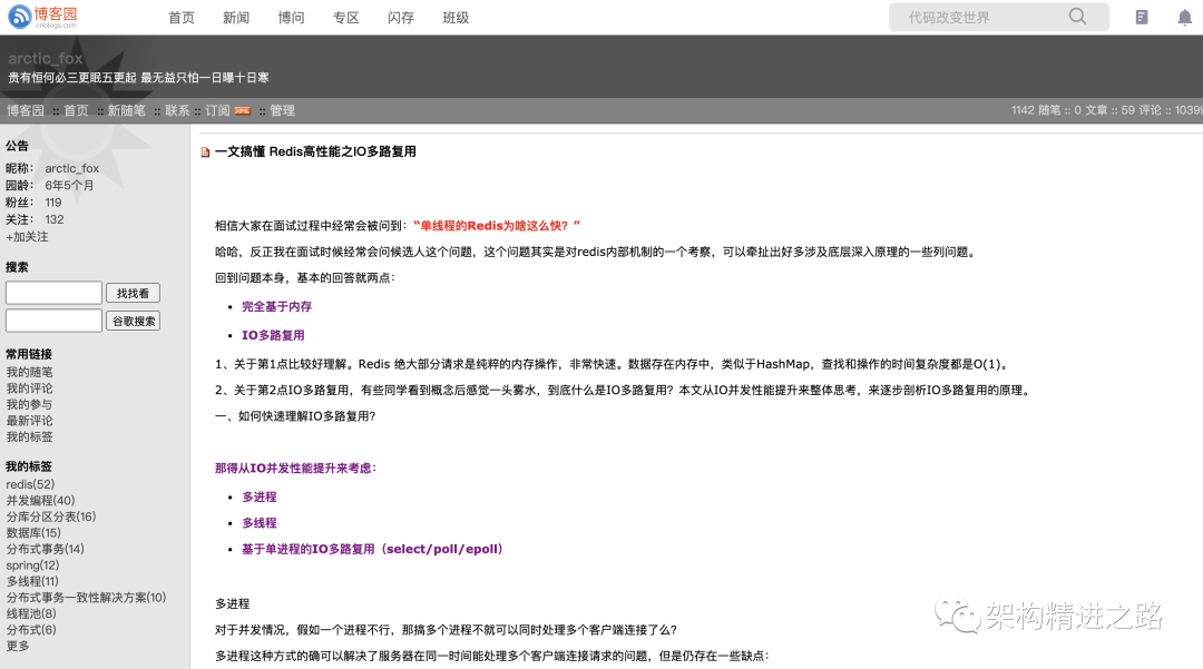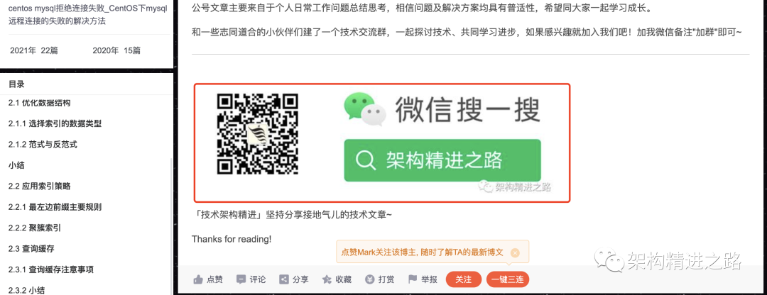 所以近半年改为微信公众号《架构精进之路》,专注软件架构研究,技术学习与职业成长。作为个人主要技术沉淀,同时会同步分享至其他主流技术社区,希望能够将技术经验总结分享出去,影响更多的人。