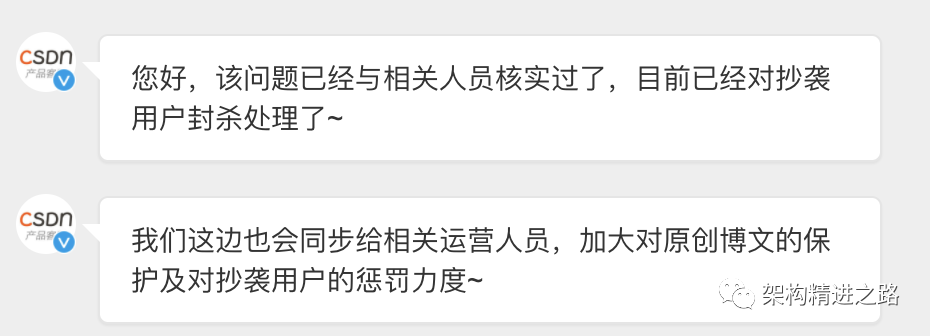 对于文章搬运剽窃情况,反馈给CSDN用户运营同学之后,大概的回复思路就是类似这样:
