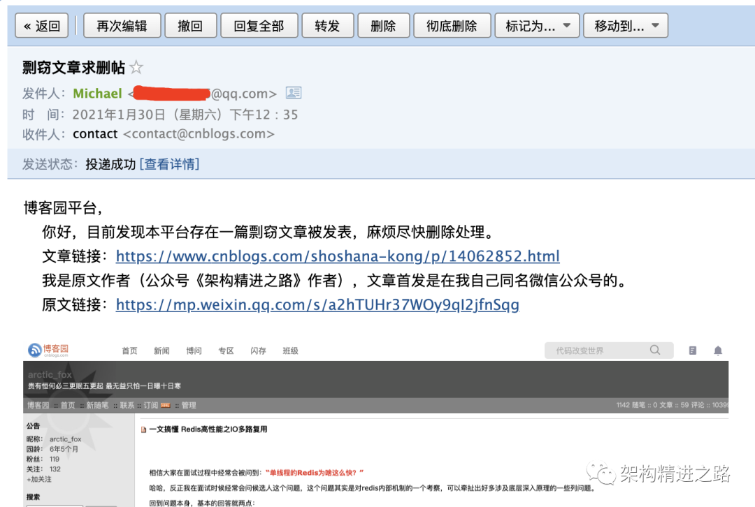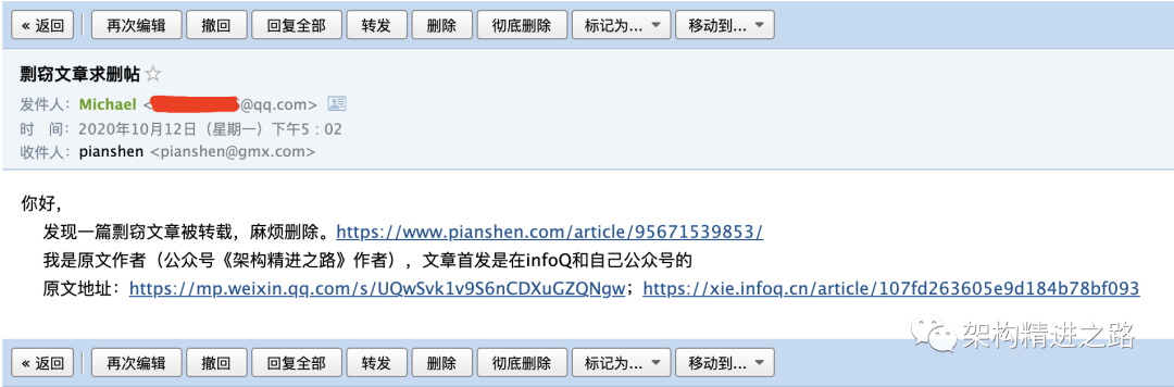 由于文章也已经同步发表在了infoQ社区写作平台,得知搬运情况后,社区用户运营同学积极跟进解决侵权行为,在此给一个大大的赞👍!