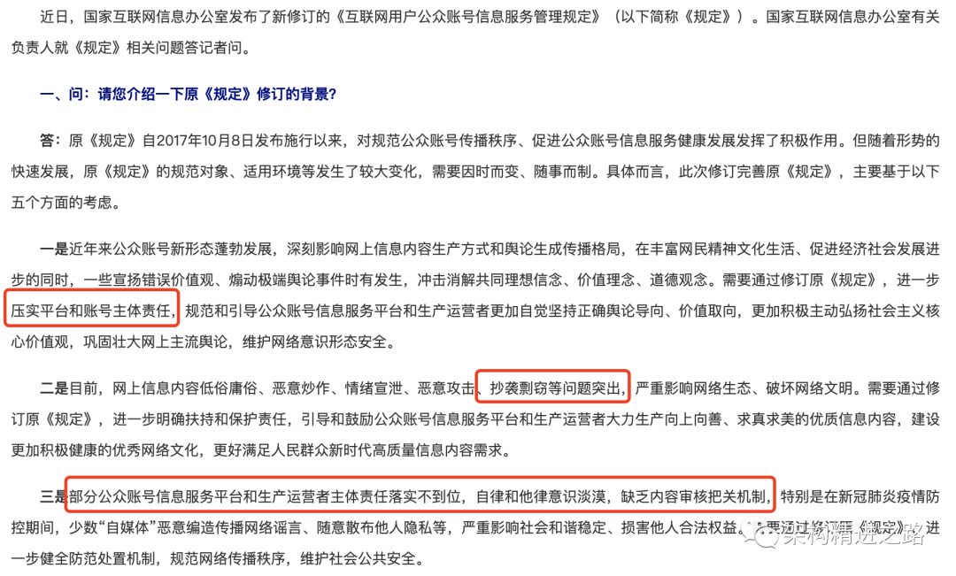 新规分别对社区及个人信息运营做了要求说明,明确了信息服务平台和生产运营者主体责任以及对抄袭剽窃等问题处理决议。