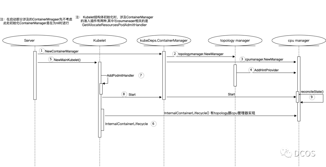 6、构建Kubelet结构体时,将CPU管理器跟拓扑管理器封装为InternalContainerLifecycle接口,其实现Pod相关的生命周期资源管理操作,涉及CPU相关的是PreStart方法