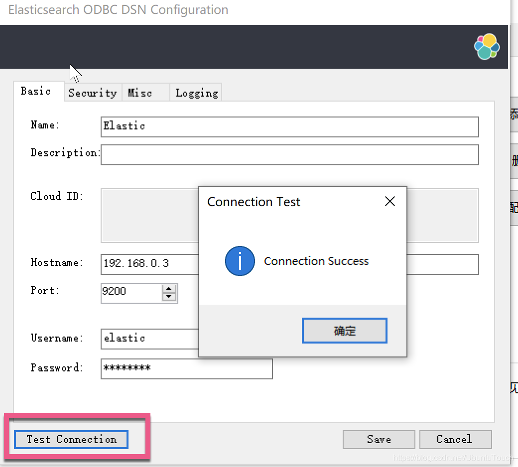 点击 Test Connection。如果我们看见 Connection Success,则表明 ODBC 和 Elasticsearch 的连接是没有任何问题的。