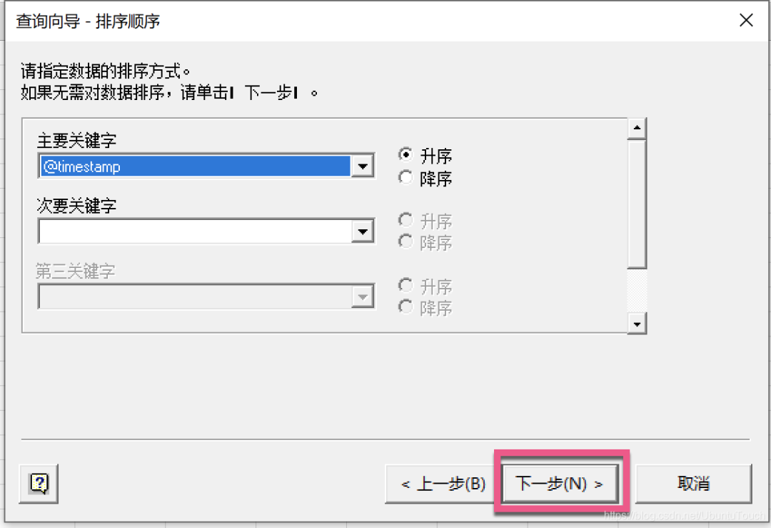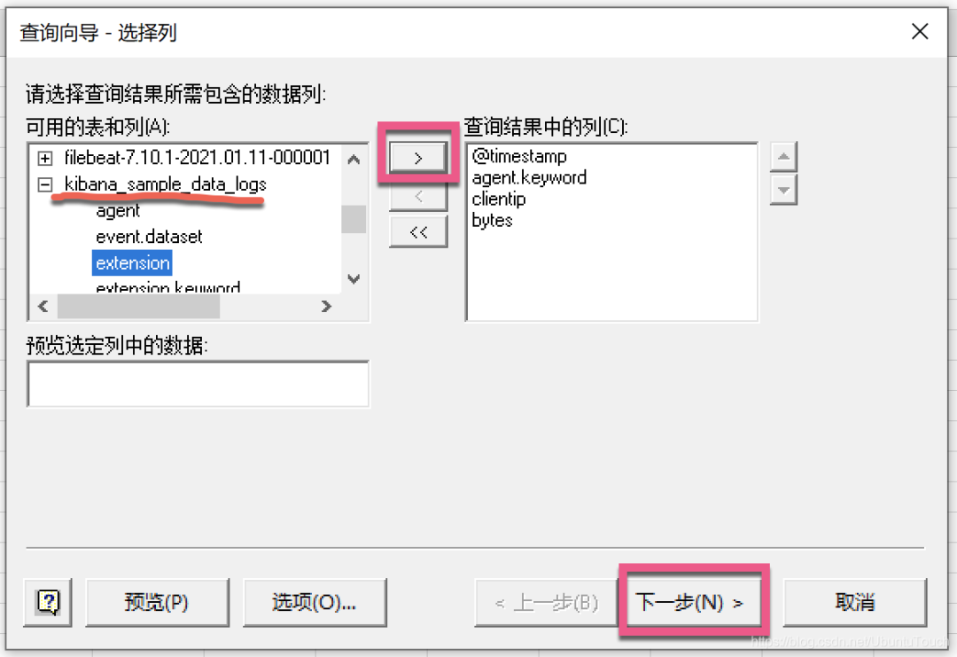 我们选择喜欢的索引,并选中其中想要的字段。点击 > 符号,并把相应的字段选入。选完后,点击 “下一步”: