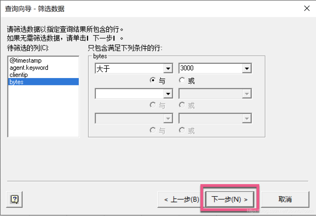 我们可以分别对相应的字段进行查询。例如,在上面,我们只对 bytes 大于3000 的文档感兴趣。等我们选择完后,点击 “下一步”: