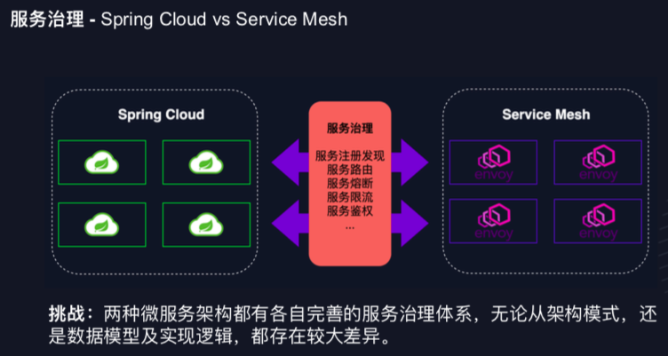 第二,微服务框架的挑战,Spring Cloud 和 Service Mesh 都各自完善的服务治理体系和实现机制,如何让两者的服务互相通信?服务注册发现、路由、限流、熔断等治理能力如何拉通并且统一治理呢?