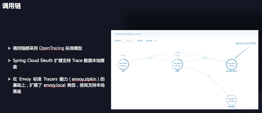 对于 Service Mesh,Trace 由 Envoy 输出,Envoy 原生是支持 Open Tracing 的,但后端需要接 Zipin 或者 Jeager 这样的 Trace 服务,我们这里也做了些扩展,在原生 envoy.zikin 实现的基础了扩展了 envoy.local,使其支持 Trace 日志本地落盘。