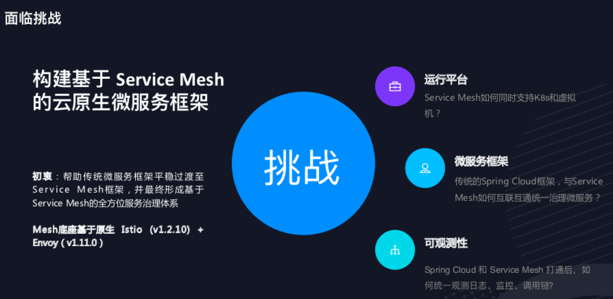 第一,运行平台的挑战,我们知道 Istio 是强依赖于 K8s 平台的,如应用生命周期管理、服务注册、健康检查、服务寻址、策略配置管理等等,那对于物理机或虚机平台这些能力如何支撑呢?