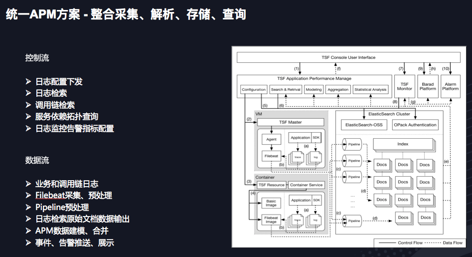 首先,我们来看下右边这个架构图,整个 APM 方案,分为控制流和数据流;先来看下控制流,图上的实线: