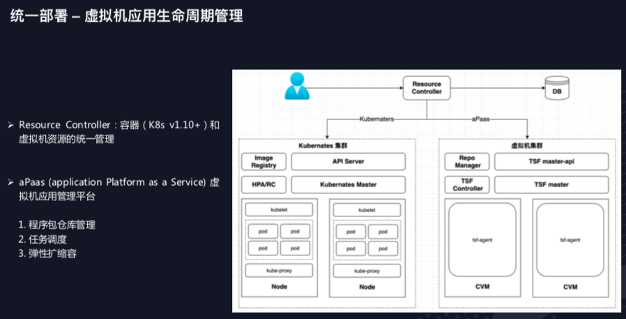 同样,我们引入 Resource Controller 资源管控模块这样一个中间层来解决容器和虚拟机统一管理的问题;对于应用容器部署,Resource Controller 适配标准的 K8s 的 API Server 接口,如图中左边部分,可以对接任何支持标准 K8s 接口的容器平台,如 TKE、灵雀云等,这里就不过多介绍了。