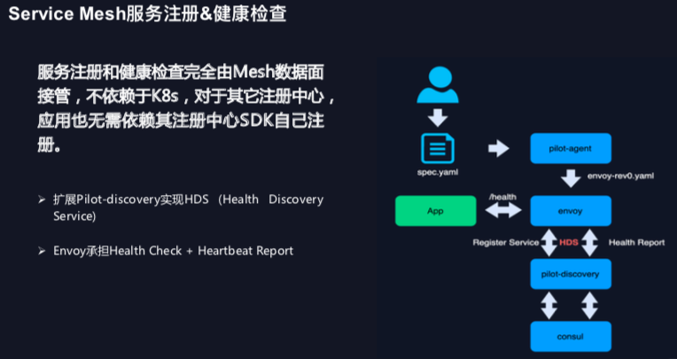 f. 对于运行时,Envoy 根据 spec.yaml 文件中配置的健康检查接口周期探测本地应用的健康状态,再通过 HDS 上报给 pilot-discovery,这里在实现中复用了 Envoy 的 Health Check 功能,只是原生实现需要通过主动配置 Envoy 规则来探测外部 upstream 的健康状态,我们这里做了定制,可以在运行时主动探测本地服务的健康状态。