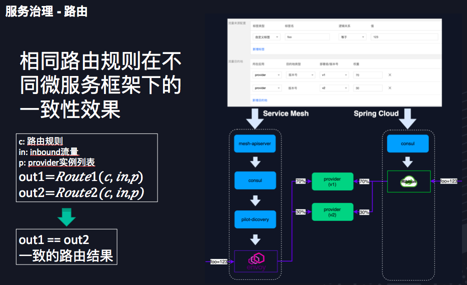 下面,我们以服务路由为例,具体介绍下如何拉通两个框架的路由能力。所谓拉通服务路由,我们的理解是:在配置相同路由规则的情况下,输入相同的请求流量,不论是 Spring Cloud 实例还是 Service Mesh 实例都能达到一致的路由效果,也就是上面抽象出的公式,