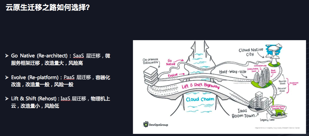 最上面那条路,Go Native 迁移,平台架构、微服务架构直接重构只云原生形态,迁移思路非常直接,但道路曲折,改造量大,且风险极高,很容易掉沟里;