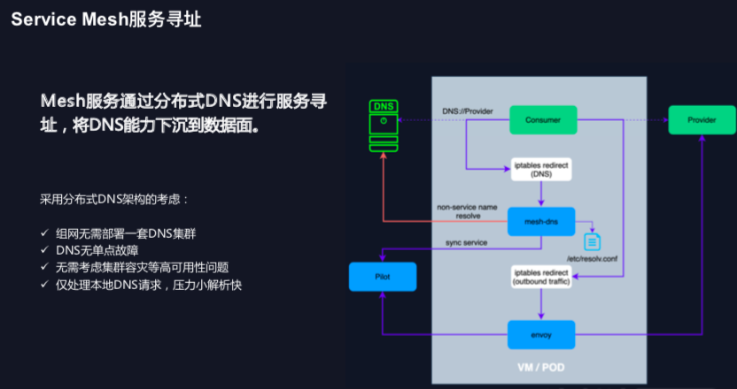 由于原生 Istio 是依赖 K8s 的 Kube-DNS 或 Core-DNS 这样的集中式 DNS 服务进行服务名的寻址的,而与 K8s 解耦后我们需要重新选择一个 DNS 方案,这里我们采用了一个分布式 DNS 方案,将 DNS 能力下沉到数据面,而采用这种 DNS 架构方式,主要考虑到以下 4 个原因: